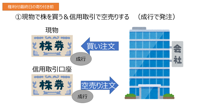 現物の買いと空売りの株数は同じにしましょう。また、成行で発注する必要があります。